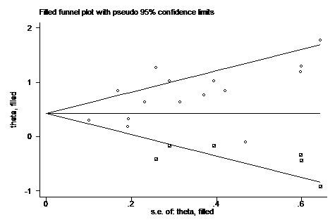 Figure 5: Funnel plot with trim and fill. Circle represent identified studies, square represent estimated missing studies after adjustment for publication bias.