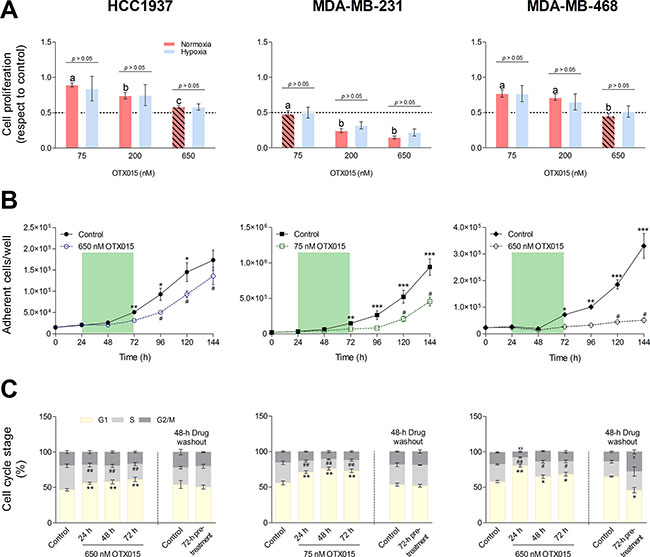 Figure 1: Characterization of OTX015 antiproliferative activity in three TNBC cell models. (A) Cells were seeded under normoxic and hypoxic conditions and treated with OTX015 for 72 h. The antiproliferative effect was determined by cell counting. The diagonal-line pattern (