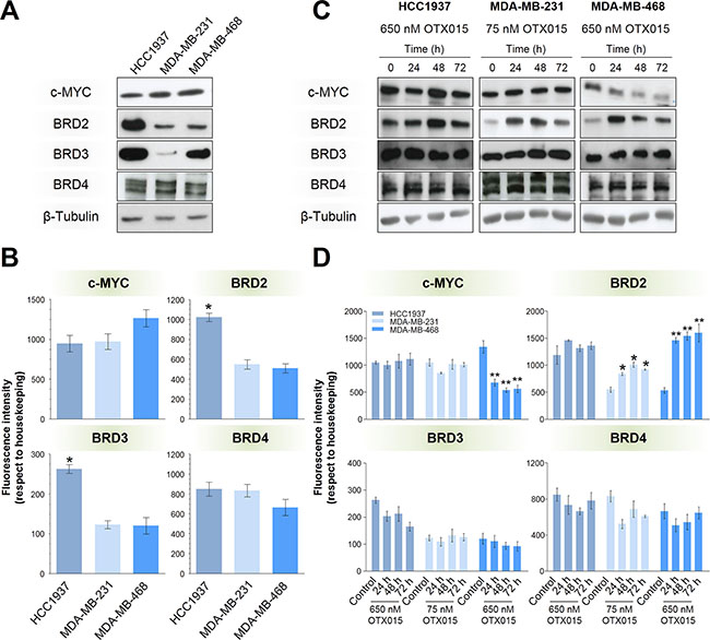 Figure 2: Baseline and post-OTX015 expression of BRD2/3/4 and c-MYC. Basel expression of BRD2/3/4 and c-MYC in terms of protein (A) and mRNA (B) levels were evaluated in the three cell lines by Western blotting and qRT-PCR, respectively. Protein (C) and mRNA (D) levels were evaluated after 24-, 48- and 72-h OTX015 (650 nM in HCC1937 and MDA-MB-468 cells, and 75 nM in the MDA-MB-231 cell line). Significant differences in mRNA levels were determined by one-way ANOVA test (p < 0.01) followed by an SNK a posteriori test (*p < 0.05, **p < 0.01). Western blots are representative of at least three independent experiments. Bars and vertical lines represent the mean ± SEM, respectively (n = 3).