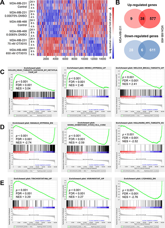 Figure 3: Gene expression profiling in OTX015-treated TNBC cell models. (A) GEP heat maps in OTX015-treated MDA-MB-231 and MDA-MB-468 cell lines, compared to vehicle-treated control cells. Red and blue indicate up-regulated and down-regulated genes respectively. (B) Venn diagram of 81 and 1286 differentially expressed genes in MDA-MD-231 and MDA-MB-468 OTX015-treated cells, respectively. GSEA analyses showed common signatures enriched, using the complete MSigDB (C), up-regulated and (D), down-regulated) and CMAP databases (E) in OTX015-treated MDA-MB-231 and MDA-MB-468 cell lines. FDR, false discovery rate; NES, normalized enrichment score.
