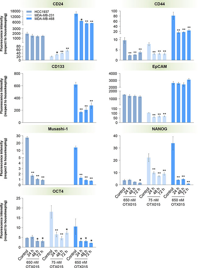 Figure 4: Effect of OTX015 on the expression of cancer stem cell markers in TNBC cell models. Cells were exposed for 24, 48 and 72 h to OTX015 (650 nM for HCC1937 -■- and MDA-MB-468 -■-, and 75 nM for MDA-MB-231 cells -■-) and expression of stemness-related genes was determined by qRT-PCR. Differences in the mRNA levels of OTX015-treated cells vs. controls were determined by a one-way ANOVA test (p < 0.01) followed by an SNK a posteriori test (*p < 0.05, **p < 0.01). Bars and vertical lines represent the mean ± SEM, respectively (n = 3).