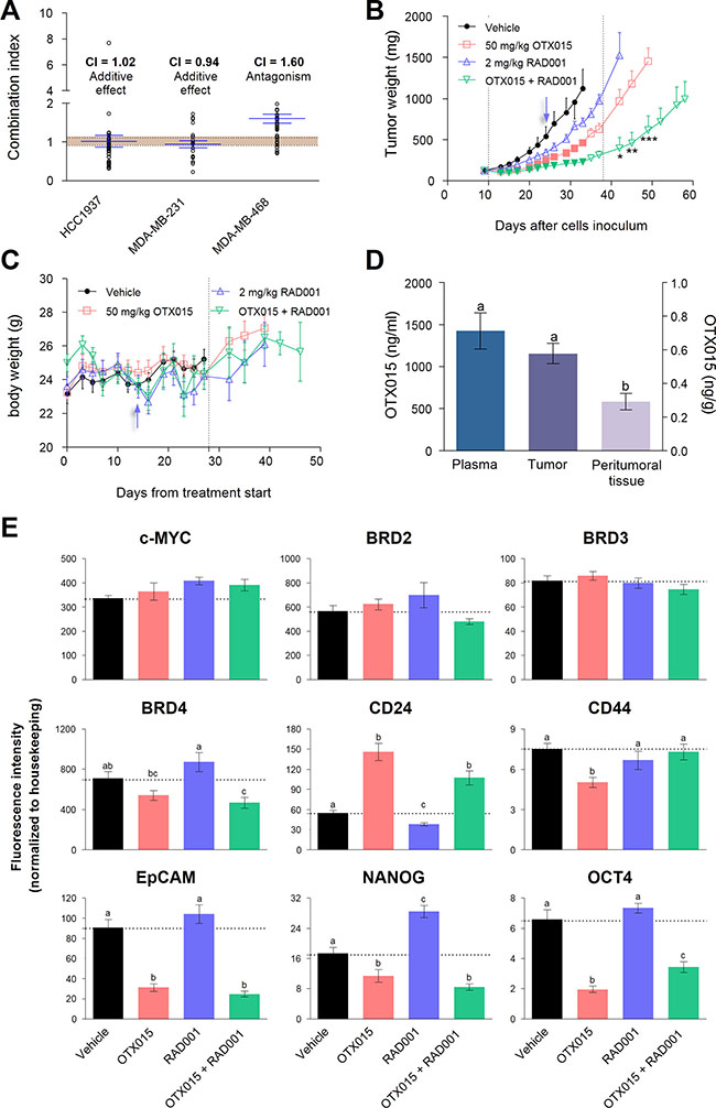 ) in MDA-MB-231 murine xenografts. Tumor weight was compared between drug regimens at each time point using a two-way ANOVA test (p < 0.001) followed by Bonferroni a posteriori test on log-transformed data. Color-filled symbols indicate significant (p < 0.05) differences between treated vs. vehicle mice (●). Significant differences in tumor mass between the combination versus single agent treatment after drug withdrawal are shown (*p < 0.05, **p < 0.01 and ***p < 0.001). Dotted lines define the treatment period. (C) Animal body weight during treatment (dotted lines) and subsequently. Results represent the mean ± SEM (during treatment, n = 9). Arrows in B and C indicate the change in the everolimus dosing schedule. (D) OTX015 levels in plasma and tissues from OTX015-treated mice, 4 h after the last dose. Variations in OTX015 concentrations detected between plasma, tumor and peritumoral tissue were evaluated by a one-way ANOVA test (p < 0.01) followed by an SNK a posteriori test. Letters above the bars indicate substantial differences (p < 0.05). (E) mRNA levels of c-MYC, BRD2/3/4, and CSC markers were determined by qRT-PCR in MDA-MB-231 tumors after 4-week treatment with OTX015 (■), everolimus (RAD001, ■) or the combination (■). Variations between the experimental groups were evaluated by a one-way ANOVA test (p < 0.001) followed by an SNK a posteriori test. Letters above the bars indicate significant differences (p < 0.05) in mRNA levels among the experimental groups. Bars and vertical lines represent the mean ± SEM, respectively (n = 4).