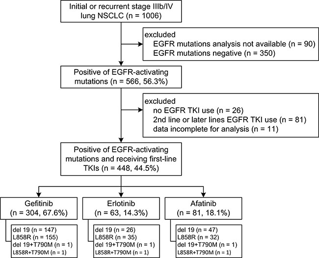 This study was conducted at Linkou Chang-Gung Memorial Hospital (LK-CGMH), a university-affiliated medical center with more than 8,00 newly-documented cases of lung cancer a year. In Taiwan, gefitinib has been reimbursed by the National Health Insurance program (NHIP) for the first-line treatment of patients with stage IIIb or IV non-small cell lung cancer with EGFR-activating mutations since June 2011, with erlotinib and afatinib being added in November 2013 and May 2014, respectively. Patients were included into this study if they had: (1) initial or recurrent stage IIIb or IV lung adenocarcinoma that had been diagnosed at LK-CGMH between February 16, 2011 and October 30, 2015; (2) activating somatic EGFR mutations; and (3) treatment with first-line gefitinib, erlotinib, or afatinib. The Institutional Research Ethics Committee of CGMH approved this study.
