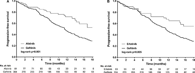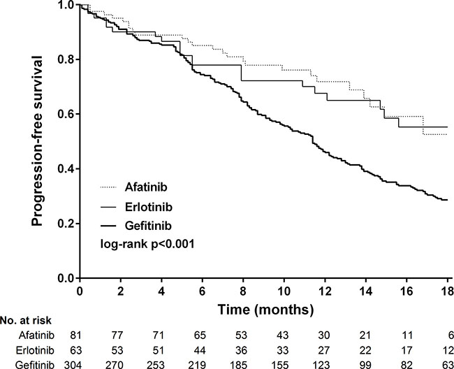 Between February 16, 2011 and October 30, 2015, 1006 patients were screened, 448 (44.5%) of whom had newly diagnosed or recurrent stage IIIb/IV lung adenocarcinoma and received first-line gefitinib (n = 304), erlotinib (n = 63), or afatinib (n = 81) (Figure 1). Baseline demographics were similar between the treatment groups, except for a slight imbalance in sex (p = 0.213) and performance status (> 1, 24% in the gefitinib arm, p = 0.017, Table 1). The composite of exon 19 deletions or Leu858Arg in each arm was not statistically significant (p = 0.119), albeit a slightly higher percentage of exon 19 deletions (59.3%) in the afatinib group. The frequency of compound mutations were listed in Supplementary Table S2. The median outpatient dosages of gefitinib, erlotinib and afatinib were 248 mg/day (IQR, 238–250), 149 mg/day (IQR, 140–150), and 39 mg/day (IQR, 32– 40), respectively. The median durations of follow-up for progression-free survival were 12.1 months in the gefitinib arm (IQR 5.5–16.5), 11.2 months in the erlotinib arm (IQR 4.9–16.7), and 10.3 months in the afatinib arm (IQR 7.0–14.2). After 18 months of progression-free survival, 63 (20.7%) patients were still receiving treatment in the gefitinib arm, compared to 12 (19.0%) patients in the erlotinib arm and six (7.4%) in the afatinib arm. Progression-free survival was significantly longer in the patients who received afatinib or erlotinib compared to those who received gefitinib (log-rank test, p = 0.0001, Figure 2). The median progression-free survival was not reached in the afatinib and erlotinib groups, and 11.4 months in the gefitinib group (afatinib versus gefitinib, p < 0.001 and erlotinib versus gefitinib p = 0.005, respectively, Figure 3A and 3B).