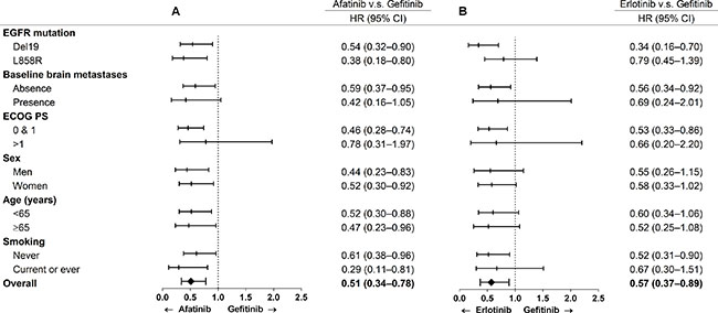 There are several limitations to this study. First, the median follow-up time was less than 1 year in the erlotinib and afatinib arms, and neither arm reached their median progression-free survival. However, the median follow-up time in the gefitinib arm was 12.1 months, which may serve as a good reference compared with previous studies [12–15, 33, 37, 42–44], and 79.3% of these patients had clinical progression or death then. The differences between erlotinib and afatinib compared to gefitinib were evident, although they may be relatively modest with longer follow-up. Nevertheless, this is unlikely to substantively change our results. Second, the number of cases differed in the three arms, and more patients received gefitinib than erlotinib or afatinib. However, there were no significant differences in demographic data except for more patients with a poor performance status in the gefitinib group. In addition, some clinical factors such as pleural effusion were not documented, which may have been a source of confounding. On the other hand, baseline brain metastasis and smoking status were relatively consistent in all treatment arms. These factors have been reported to be prognostic factors in these patients, and thus we adjusted for other covariates to make appropriate comparisons [44, 45]. Third, the BCL2-Like 11 (BIM) deletion polymorphism has been reported to occur in 12.8% to 18.6% of Asians, and to be associated with an inferior response to tyrosine kinase inhibitors [46–48]. Although Lee et al. reported no predictive role of BIM regarding the outcomes of tyrosine kinase inhibitor therapy [49], we did not check this in our study population. Finally, we did not report the side effects in the treatment groups. It is known that afatinib is associated with a higher frequency of diarrhea and rash, and that gefitinib is associated with a higher frequency of liver function abnormalities and interstitial pneumonitis [23, 50]. Our results of progression-free survival are based on real world practice with acceptable dosages of medication.