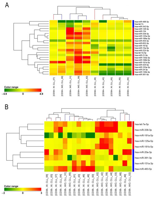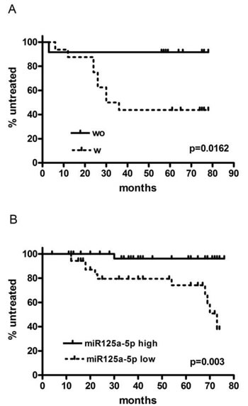 The relevance of miR-125a-5p as a biomarker of inferior outcome and genetic complexity was then validated in a prospective cohort of 71 consecutive untreated CD38- CLL patients with normal FISH or 13q deletion as single abnormality. In this validation cohort we were able to confirm the predictive role of miR-125a-5p down-regulation in terms of shorter TTFT. To our knowledge, this is the first observation linking a deregulated miRNA expression to inferior outcome in a subset of low risk CLL patients [19]. This finding is valuable because the majority of CLL patients present with low risk features at diagnosis and disease progression is difficult to predict in such cases.