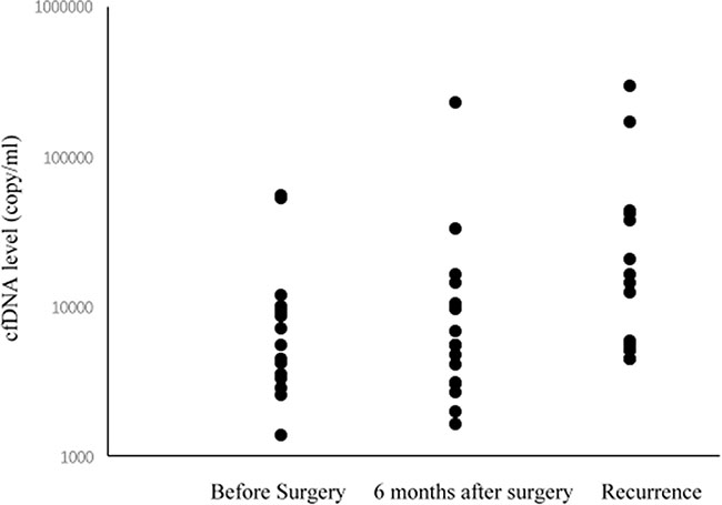 Pre- and postoperative cfDNA levels (six months after surgery and at the time of recurrence) were measured in 18 gastric cancer patients who did not receive adjuvant chemotherapy. All 18 patients had high pre- and postoperative cfDNA levels at six months after surgery and at the time of recurrence. As shown in Figure 2, persistently high and increasing cfDNA levels were observed after surgery in gastric cancer patients with tumor recurrence.