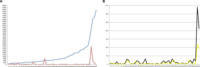 Figure 3: (A) Dynamic changes in cfDNA levels before (blue line) and after (red line) colorectal cancer tumor resection. (B) Dynamic changes in serum CEA levels before (black line) and after (yellow line) colorectal cancer tumor resection.