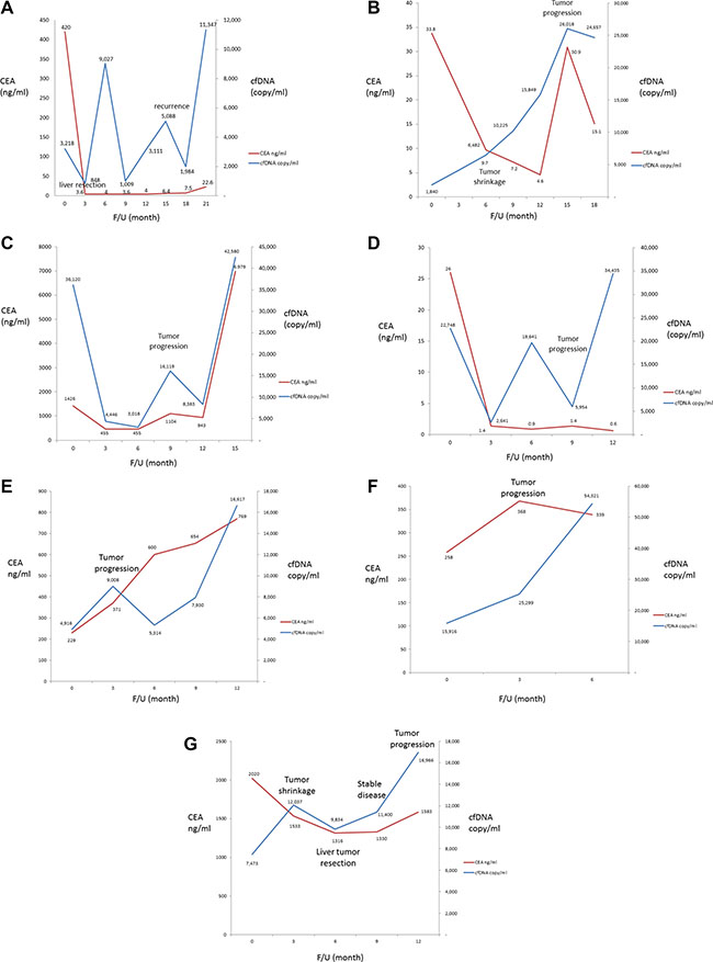 The seventh patient (Figure 4G) received treatment with bevacizumab plus FOLFORI. The patient exhibited a partial response with liver tumor shrinkage 3 months later; the serum CEA level decreased, but the cfDNA level increased. The patient underwent liver resection 3 months after the partial response and both the serum CEA level and cfDNA levels dropped. The patient remained in a condition of stable disease for 6 months and then exhibited disease progression; during this period, the cfDNA level was more prominently elevated than the serum CEA level.