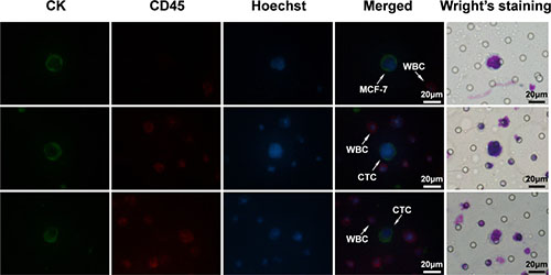 Figure 2: The images of IF staining and Wright’s staining for the same samples. MCF-7 tumor cells spiked into healthy blood samples were set as positive control. CK+/CD45-/Hoechst+ cell was scored as CTCs and CK-/CD45+/Hoechst+ cell as WBCs.