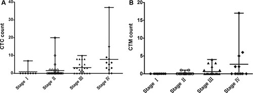 We have detected blood samples from 72 CRC patients and the clinicopathological characteristics were shown in Table 2. There were 35 colon cancer and 37 rectal cancer patients (41 male and 31 female; mean age, 60.2 years; age range, 37–84 years). CTCs were detected in 38 patients with a positive rate of 52.8%. Meanwhile, CTC clusters were found in 13 patients with a positive rate of 18.1%. Detecting results in different stages of patients were shown in Figure 4.