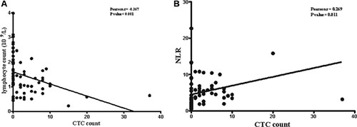 Figure 5: Correlationship of CTC counts with number of lymphocytes and NLR.