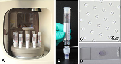 Figure 6: Introduction of the osISET device. (A) The blood samples were waiting for isolation. (B) The filter membrane picked by the forceps was at the bottom of a cylindrical filtration. (C) The calibrated 8-μm-diameter pores were shown. (D) The transparent filter membrane was placed on slide after automated isolation.