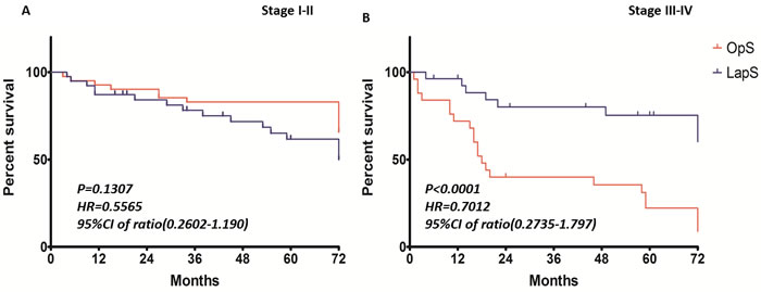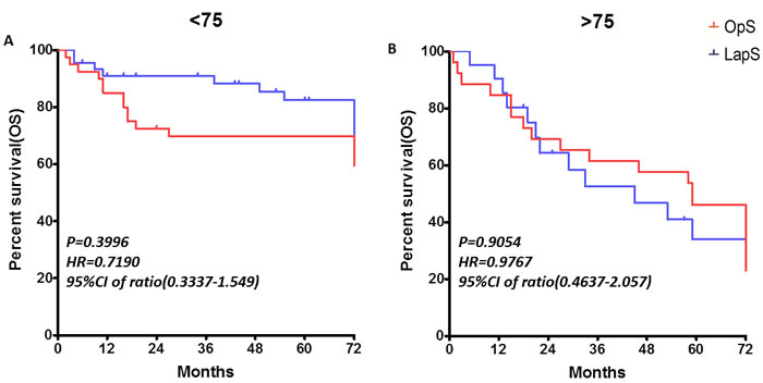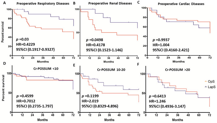 Rectal cancer is associated with substantial morbidity and mortality, especially in elder patients and those with co-morbidities. Outcome after these surgeries depends both on modifiable factors, such as perioperative medical care, and on physiological tolerance of surgical trauma. Over the last two decades, we have seen a continuous improvement of the quality of laparoscopic surgery in rectal cancer, especially in specialized centers with longstanding experience and high annual volumes. Several studies that compared laparoscopic and conventional open resection for rectal cancer show no difference with respect to local recurrence or overall and disease-free survival after 3, 5 [1, 2] even 10 years [3], respectively. More recently, long-term data including the MRC CR07 [4], MRC CLASICC trial, Comparison of Open versus laparoscopic surgery for mid or low Rectal cancer After Neoadjuvant chemoradiotherapy (COREAN) trial [5], the Colorectal cancer laparoscopic or Open Resection (COLOR II) trial [6] have released long-term survival rates. Though some of the randomized control trials have included patients with elevated preoperative risk (American Society of Anesthesiologists classification 3 and 4), these patients were generally recruited to clinical trials less often than younger patients and therefore are under-represented in publications about cancer treatment [7]. Because of this heterogeneous, can these recommendations from major studies, such as laparoscopic rectal operations are safe and sound, be extrapolated to the fragile subset of patients with more comorbidity or do they need to be modified? The aim of this study is to analysis the survival and outcomes in patients with rectal cancer associated with high operative risk in conventional open rectal resection group (OpS) and laparoscopic rectal resection group (LaPS).
