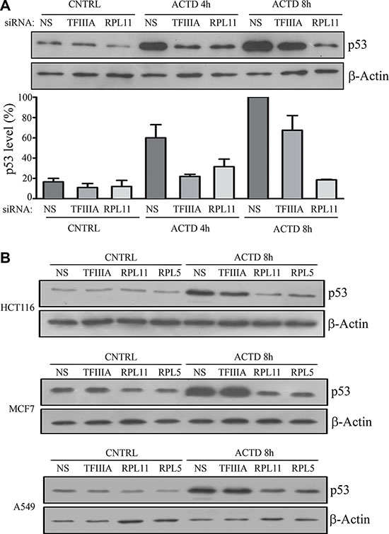 Figure 2: 5S rRNA neosynthesis inhibition do not efficiently abrogates p53 stabilization after inhibition of ribosome biogenesis. (A) Western blot analysis of p53, and β-actin as loading control, in HCT116 cell. Cells were treated with ACTD for 4 or 8 hours at 8 nM, 72 hours after the beginning of siNS, siTFIIIA and siRPL11 transfection procedure, as indicated in the upper panel. Lower panel represents the densitometric analysis of p53/β-actin ratio in which the indicated value are normalized for the maximum level of measured p53 (NS, ACTD 8 h). Graph bars represents mean ± SEM of three independent experiments. (B) Western blot analysis of p53, and β-actin as loading control, in HCT116, MCF7 and A549 cells, which were treated with ACTD for 8 hours at 8 nM, 72 hours after the beginning of siNS siTFIIIA, siRPL11 or RPL5 transfection procedure, as indicated.