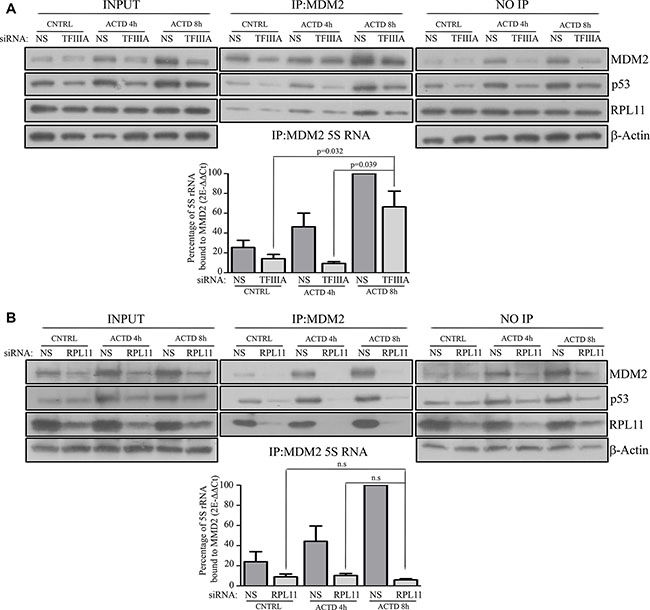Figure 3: After ribosome biogenesis inhibition the assembly of the 5S RNP complex occurs under a reduction of 5S rRNA neosynthesis. (A and B) upper panels: Western blot analysis of HCT116 MDM2-immunoprecipitated whole extract after siNS and siTFIIIA (A, upper panel) or siRPL11 (B, upper panel), treated with ACTD (8nM) for 4 or 8 hour 72 hours after the beginning of the transfection procedure, as indicated. Representative Western blots show the level of MDM2, p53, RPL11 and β-actin from whole extract (INPUT) and non immunoprecipitated proteins derived from the immunoprecipitation supernatant (NO-IP), while MDM2, p53 and RPL11 amount are shown for MDM2 immunoprecipitated samples (IP). (A and B) lower panels: RT-qPCR of MDM2 co-immunoprecipitated 5S rRNA. HCT116 cells were treated with ACTD (8nM) for 4 or 8 hours 72 hours after the beginning of siNS and siTFIIIA (A, lower panel) or siRPL11( B, lower panel) transfection procedure. The indicated value are normalized for the maximum level of immunoprecipitated MDM2 (NS, ACTD 8 h). Graph bars represents mean ± SEM of three independent experiments.