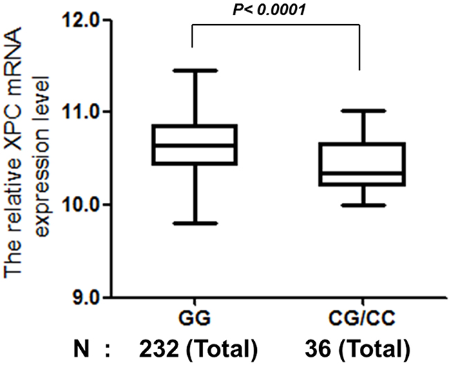 Figure 2: Correlation between XPC rs1870134 genotype and XPC mRNA expression for total populations.