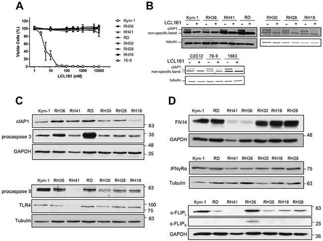 Figure 1: Kym-1 cells, but not other RMS cell lines, are sensitive to LCL161 as a single agent. A. Alamar Blue viability assays of human RMS cell lines (Kym-1, RH36, RH41, RD, RH30, RH28, RH18) and the murine cell line 76-9 with increasing concentration of LCL161 for 24 h. B. Human RMS cell lines were analysed by western blot for cIAP1 and tubulin protein expression following treatment with vehicle control (DMSO) or 5 μM LCL161 (10 nM LCL161 was used for Kym-1 cells) for 24 h. The mouse C2C12 myoblast, 76-9 RMS, and 1863 sarcoma cell lines were also analysed by western blot for cIAP1and tubulin protein expression following treatment with DMSO or 5 μM LCL161 for 24 h. C, D. Endogenous protein expression of apoptosis pathway effectors and immune modulator receptors was analysed by western blot in human RMS cell lines (C and D, respectively).