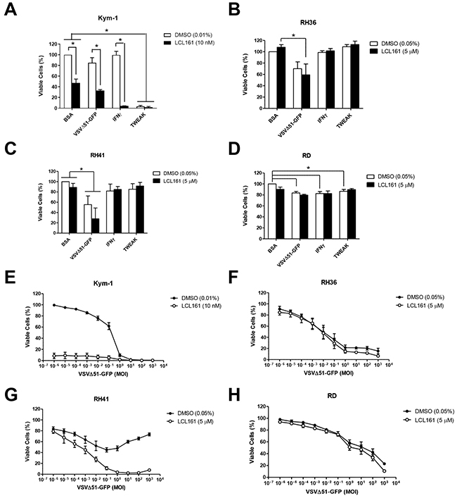 In order to determine the sensitivity of RMS cells to a combined treatment paradigm, cell lines were treated with vehicle control (DMSO) or 5 μM LCL161 (10 nM LCL161 in Kym-1 cells) in the presence of the following innate immune stimuli: VSVΔ51-GFP, IFNγ, TWEAK, or bovine serum albumin (BSA) as a control (Figure 2). Cell viability was assessed after 24 h by Alamar Blue assay (Figure 2) and YOYO-1 staining (Supplementary Figure S2) while caspase 3/7 activation was measured by IncuCyte live cell kinetic imaging (Supplementary Figure S2). Interestingly, VSVΔ51-GFP (multiplicity of infection (MOI) 0.1) and IFNγ (1000 U/mL) were not effective when used as a single agent, but both agents synergized with LCL161 to significantly reduce viability in Kym-1 cells (Figure 2A). In addition, Kym-1 cells were highly sensitive to treatment with 100 ng/mL TWEAK, regardless whether it was used in combination with LCL161. In comparison, IFNγ and TWEAK did not reduce viability in RH36 or RH41 cell lines, nor did the immune stimulants synergize with LCL161 (Figure 2B-2D). The addition of VSVΔ51-GFP resulted in significantly reduced cell viability in LCL161-treated RH36 cells. Furthermore, VSVΔ51-GFP decreased cell viability in both DMSO-treated and LCL161-treated RH41 cells. Cell viability was reduced in DMSO-treated RD cells with the addition of VSVΔ51-GFP, IFNγ, and TWEAK. LCL161 did not synergize with immune stimulants in RD cells to promote cell death. Since VSVΔ51-GFP treatment promoted at least a modest reduction in viability in all RMS cell lines tested, we further assessed the effect of oncolytic virus on cell viability in these cells. We performed Alamar Blue viability assays of RMS cell lines treated with vehicle or LCL161 and increasing MOI of VSVΔ51-GFP for 24 h (Figure 2E-2H). Indeed, while all four RMS cell lines were sensitive to VSVΔ51-GFP, synergistic reductions in cell viability were only observed in Kym-1 and RH41 cells that were treated with LCL161. Of note, the long term survival (as determined by a clonogenic assay) was severely impacted in all four cell lines treated with VSVΔ51-GFP with or without LCL161 (Supplementary Figure S3).