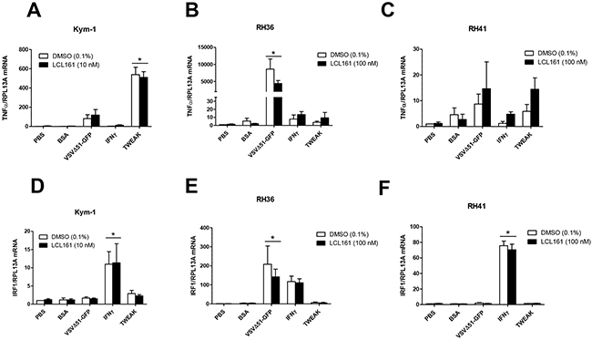 Figure 3: TNFα and IRF1 mRNA expression in RMS cell lines after treatment with innate immune stimuli. A, D. Kym-1 cells were treated with vehicle control (DMSO) or 10 nM LCL161 and the following innate immune stimuli: PBS control, BSA control (80 pg/mL), VSVΔ51-GFP (MOI 0.1), IFNγ (1000 U/mL), TWEAK (100 ng/mL) and mRNA expression of TNFα and interferon regulatory factor-1 (IRF-1) was assessed by qRT-PCR. LCL161-resistant RMS cell lines (RH36 and RH41) were treated with DMSO or 100 nM LCL161 and PBS, BSA, VSVΔ51-GFP, IFNγ, and TWEAK for 24 h, followed by qRT-PCR analysis of TNFα (B, C.) and IRF-1 (E, F.) mRNA expression.