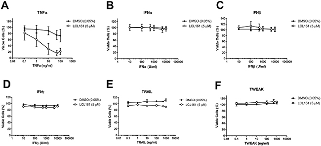 To test the efficacy of combined LCL161 and innate immune stimuli in the murine 76-9 RMS cell line, cells were treated with vehicle control (DMSO) or 5 μM LCL161 in the presence of increasing concentrations of the following innate immune stimuli: TNFα (positive control), universal type I IFNα, IFNβ, IFNγ, TRAIL, and TWEAK (Figure 4). Cell viability was assessed after 24 h by Alamar Blue assay. We observed that LCL161 sensitized 76-9 cells to TNFα-mediated cell death (Figure 4A). Viability of 76-9 cells was reduced to 15.92% following 24 h treatment with LCL161 and 50 ng/mL TNFα as compared with cells treated with DMSO and 50 ng/mL TNFα, which were 75.38% viable (p < 0.05). In contrast, viability of 76-9 cells was unaffected by universal type I IFNα, IFNβ, IFNγ, TRAIL, and TWEAK. Furthermore, LCL161 did not combine with any of these innate immune stimuli to reduce viability in 76-9 cells (Figure 4B-4F).