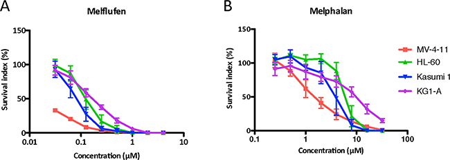 Figure 1: The cytotoxic activity (as concentration vs survival measured by FMCA) of melflufen A. and melphalan B. in AML cell lines MV-4-11, HL60, Kasumi and KGI-A. Mean values with SD of three independent experiments.
