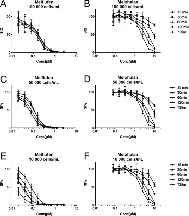 Figure 3: Time course for melflufen’s accumulation and cytotoxic effect in CCRF-CEM leukemia cells. The peptidase-potentiated effect results in a rapid accumulation of the active drug, and with decreasing cell densities A-C-E. there are more drug molecules per cell, and activity increases (curves shifts to the left). The rapid accumulation results in a competition for melflufen, and with high cell densities (A) maximum effect is obtained already after 15 minutes, i.e. cells have taken up all melflufen from the medium. When the cell number is lower (C and E) there is a time course for the accumulation, and longer exposure yields higher activity (i.e. lower IC50). For melphalan the situation is completely different as the absorption of the drug is slow; longer exposure time results in higher activity regardless if the cell density is high or low, suggesting rather slow absorption and a concentration equilibrium B-D-F.