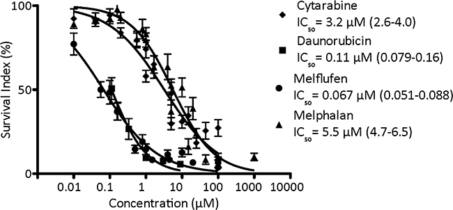 Figure 4: The cytotoxic activity (as concentration vs survival measured by FMCA) and mean IC50 (95% confidence intervals) of cytarabine, daunorubicin, melflufen and melphalan in AML patient samples. Error bars denote SEM.