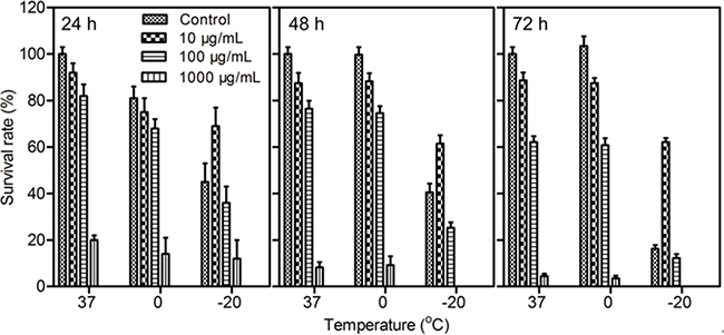 Figure 2: Survival rates of MCF-7 cells treated with Fe3O4 nanoparticles for 24 h, 48 h or 72 h at 37°C, 0°C or -20°C. Data are presented as the mean ± S.D. (n=5).