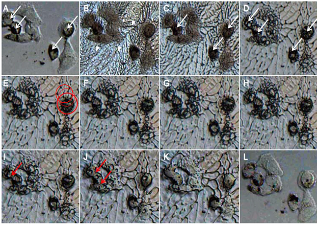 Figure 4: Cell cryomicroscopy images of MCF-7 cells during the freezing and thawing process. MCF-7 cells were treated with 100 μg/mL Fe3O4 nanoparticles and were washed with PBS twice before freezing. A. At 20°C before freezing. B. At -13.6°C during freezing. C. At -13.8°C during freezing. D. At -16.3°C during freezing. E. At -25.9°C during freezing. F. At -32.6°C during freezing. G. At -40°C, the final state before thawing. H. At -30.7°C during thawing. I. At -17.7°C during thawing. J. At -11.3°C during thawing. K. At -7.9°C during thawing. L. At 20°C after thawing.