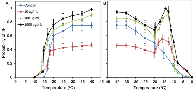 The probability of IIF in MCF-7 cells treated with 10 μg/mL Fe3O4 nanoparticles in the -20°C to -40°C temperature range was obviously lower than that of the cells treated with the control and with the 100 μg/mL and 1000 μg/mL Fe3O4 nanoparticles, demonstrating that the IIF probability was closely associated with the concentration of Fe3O4 nanoparticles.
