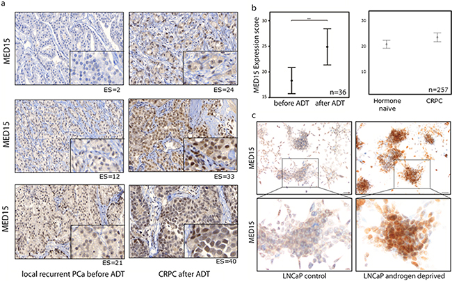 Figure 1: Increased MED15 expression following androgen deprivation of PCa cells. a. Increased MED15 expression by immunohistochemistry in local recurrent CRPC after ADT (right) compared to hormone-naïve local recurrent PCa from same patient before ADT (left). Expression score for each staining is mentioned below. Scale bar, 50µm or 10µm. b. Higher mean expression score (ES) of MED15 in 36 local recurrent CRPC samples after ADT (ES=24.9) compared to 29 local recurrent PCa samples before ADT (ES=18.3) of same patients. Higher mean ES of MED15 in 145 CRPC samples (23,9) compared to 112 hormone-naïve PCa samples (20,9). Bars indicate the mean with 95% coincidence interval of the MED15 ES (independent t-test, ** p < 0.01). Data are represented as mean ± SEM. c. Increased MED15 expression in LNCaP cells grown under androgen deprived conditions compared to cells grown in the presence of androgens as control after 72h by immunocytochemistry. Scale bar 50µm.