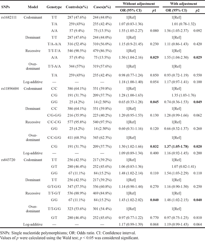 After adjusting for age, the models were further analyzed using unconditional logistic regression analysis of SNPs associated with lung cancer (Table 3). We found that the AA genotype of rs1682111 was associated with increased lung cancer risk under the recessive model (crude, OR=1.50, 95%CI: 1.04-2.16, p=0.029; adjusted for age, OR=1.55, 95%CI: 1.04-2.30, p=0.029). We also noticed that rs11896604 was associated with lung cancer risk in codominant model (“GG”, crude, OR=0.65, 95%CI: 0.33-1.28, p=0.045; adjusted for age, OR=0.74, 95%CI: 0.36-1.53, p=0.049) and over-dominant model (“CG”, crude, OR=1.30, 95%CI: 1.02-1.66, p=0.032; adjusted for age, OR=1.37, 95%CI: 1.05-1.78, p=0.020). In addition, the GG genotype of rs843720 increased the risk of lung cancer under the recessive model (crude, OR=1.43, 95%CI: 1.02-2.02, p=0.040; adjusted for age, OR=1.48, 95%CI: 1.02-2.15, p=0.040).