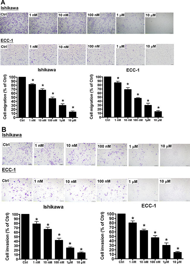 Figure 2: GHRH antagonist inhibits endometrial cancer cell migration and invasion. (A) Using the Transwell migration assay, the migration and invasion capability of endometrial cancer cells was assessed. The GHRH antagonist suppressed the migration of endometrial cancer cells through an uncoated porous filter in a dose-dependent manner at concentrations of 1 nM to 10 μM, with a maximal effect at 10 μM. (B) Endometrial cancer cells were seeded onto a Matrigel-pre-coated filter in Transwell chambers in the presence or absence of increasing concentrations of GHRH antagonist (1 nM to 10 μM, as indicated). After 24 (migration) and 48 (invasion) h of incubation, cells on the upper side of the filter were removed, and the cells that migrated or invaded were fixed, stained, and counted. On the left, representative pictures are shown. In the columns, the mean number of migrated or invaded cells in five fields of triplicate wells from three independent experiments is presented. Bars, SD; *p < 0.05, versus control.