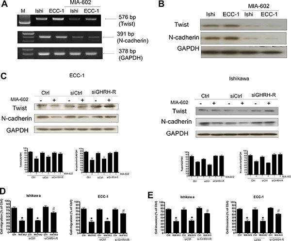 Figure 5: The effects of the GHRH antagonist (MIA-602) on Twist and N-cadherin signaling in endometrial cancer cells. (A) Effects of MIA-602 on Twist and N-cadherin mRNA expression. Cells were treated with MIA-602 (100 nM), and then semiquantitative RT-PCR analysis of Twist and N-cadherin mRNA levels in Ishikawa and ECC-1 endometrial cancer cells was performed. A 100-bp ladder is shown in lane M (marker) with the size of the target cDNA indicated at the right. Absorbance values for Twist and N-cadherin mRNA were standardized to GAPDH mRNA levels. The results are expressed as the mean ± SEM of three independent experiments. (*p < 0.05, versus control). (B) Effects of MIA-602 on Twist and N-cadherin protein expression. Western blotting analysis of Twist and N-cadherin protein expression in Ishikawa and ECC-1 endometrial cancer cells. Absorbance values for Twist and N-cadherin protein were standardized to GAPDH protein levels. The results are expressed as the mean ± SEM of three independent experiments. (*p < 0.05, versus control). (C) The endometrial cancer cells (right column: ECC-1, left column: Ishikawa) were transfected with either siGHRH-R or siCtrl for 24 h using Lipofectamine RNAiMax, and Twist and N-cadherin activity was monitored by Western blotting, revealing that the MIA-602-induced decreased levels of Twist and N-cadherin activity were rescued following siGHRH-R transfection. GAPDH served as a loading control. (D) The effects of GHRH-R siRNA (siGHRH-R) transfection on MIA-602-induced inhibition of cell migration. Ishikawa and ECC-1 cells were transfected with siGHRH-R and treated with MIA-602 (100 nM) every 24 h for 72 h. Cell migration was assessed by the migration assay, and the results indicated that transfection with siGHRH-R rescued endometrial cancer cells from MIA-602-induced inhibition of cell migration. The results are expressed as the mean ± SEM for three independent experiments (*p < 0.05, versus control; #p < 0.05, versus MIA-602). (E) The effects of GHRH-R siRNA (siGHRH-R) transfection on MIA-602-induced suppression of cell invasion. Ishikawa and ECC-1 cells were transfected with siGHRH-R and treated with MIA-602 (100 nM) every 24 h for 72 h. Cell invasion was assessed by the invasion assay, and the results indicated that transfection with siGHRH-R rescued endometrial cancer cells from MIA-602-induced suppression of cell invasion. The results are expressed as the mean ± SEM for three independent experiments (*p < 0.05, versus control; #p < 0.05, versus MIA-602).