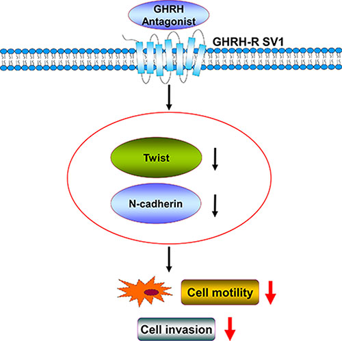 Figure 6: The proposed signaling pathways involved in GHRH antagonist–inhibited invasion and migration of human endometrial cancer cells by down-regulating Twist and N-cadherin expression. GHRH antagonist suppresses the invasion and migration of endometrial cancer cells through binding of GHRH receptors and suppression of the Twist and N-cadherin pathways.