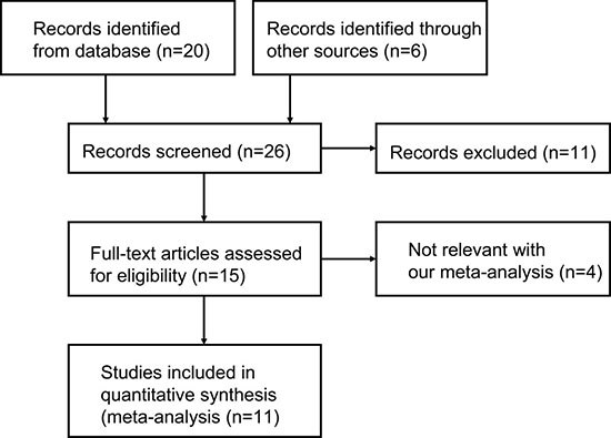 A total of 26 articles on relationship between HOTAIR SNPs and cancer risk were retrieved after first search in PubMed, Embase and Web of Science. As shown in Figure 1, 11 case-control publications including 10867 patients and 13172 controls met the inclusion criteria and 5 HOTAIR SNPs were involved in the meta-analysis [23–33]. The main characteristics of 5 HOTAIR SNPs were listed in Table 1. Of the 11 studies, the HOTAIR rs4759314 in 8 studies [23–25, 27, 29–32], rs920778 in 6 studies [23, 26–28, 30, 33], rs7958904 in 4 studies [24, 29, 31, 32], rs874945 in 4 studies [24, 29, 31, 32] and rs1899663 in 3 studies [23, 27, 30] were analyzed, respectively. Genotyping data obtained came from PCR-RFLP and TaqMan detection methods. Genotype and allele frequencies, sample size and other information were revealed in Table 1. Of the 11 studies, 4 presented a significant deviation from HWE (2 studies on rs4759314 [31, 32], 3 on rs920778 [23, 27, 33] and 2 on rs874945 [31, 32]). NOS scale in each study was assessed and the results showed that all the studies had high-quality (Table 2). Of the 11 studies, 2 populations including Chinese and Turks and 7 types of cancer involving ESCC, colorectal cancer, gastric cancer, breast cancer, osteosarcoma, EOC and cervical cancer were used for group analysis (Table 1).