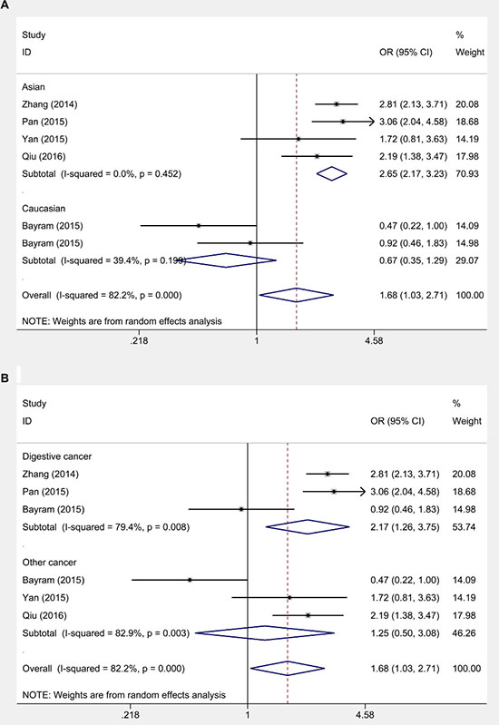 Figure 2: Subgroup analysis on relationship between HOTAIR rs920778 (C>T ) and cancer risk. (A) Ethnicity analysis. (B) Cancer type analysis.