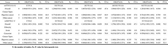 Table 3: Results of meta-analysis for rs4759314 and rs920778 polymorphisms and the risk of cancer