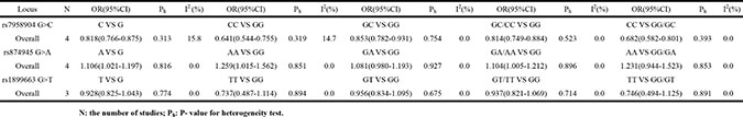 Table 4: Results of meta-analysis for rs7958904, rs874945 and rs1899663 polymorphisms and the risk of cancer