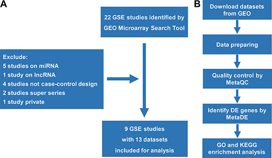 Using the Gene Expression Omnibus (GEO) Microarray Search Tool (http://gbnci-abcc.ncifcrf.gov/geo/ [31] , we searched the GEO database for publicly available studies from its inception to August 31, 2016, using the following keywords: “Homo sapiens” (organism), “PCOS” or “Polycystic ovary syndrome” (study keywords), and “RNA” (sample type). After a systematic review, 22 GSE studies were collected. The inclusion criteria for studies were as follows: 1) patients diagnosed with PCOS diseases and normal controls; 2) gene expression profiling of mRNA; and 3) sufficient information to perform the analysis. Then, 13 datasets from 9 studies were collected for subsequent analysis (Table 1). Figure 1A provides details of the process of data collection and study selection. The workflow of data processing and analysis is illustrated in Figure 1B.