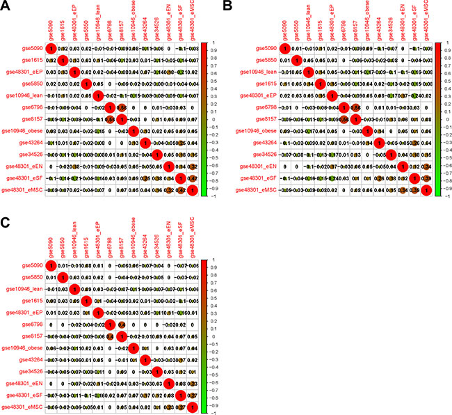 Figure 2: Correlation analyses of the relationships among 13 datasets based on gene expression variation profiles. (A) Clustering with Pearson; (B) Clustering with Spearman; (C) Clustering with Kendall correlation coefficience. The positive and negative correlations between pairs of datasets are shown as red and green respectively, and the size of node index the strength of correlation.