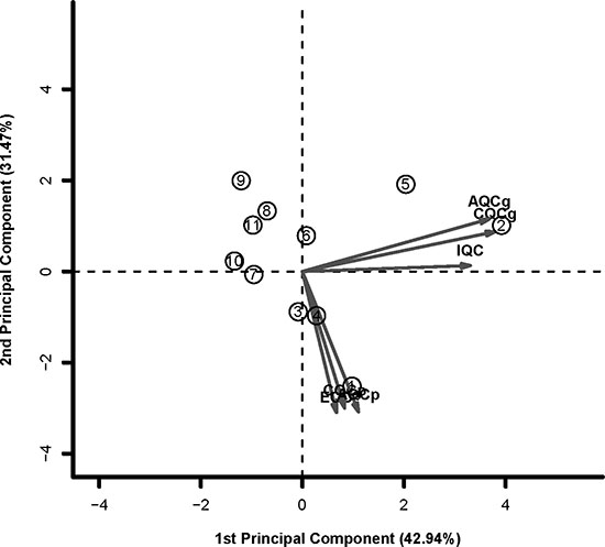 To identify datasets with high quality and consistency, we carried out the quality assessment for the 11 PCOS datasets by the R package MetaQC [24]. Six QC assessments including homogeneity of coexpression structure, accuracy and consistency of biomarkers detection with or without pathway information were calculated. As shown in Table 2 and Figure 3 with PCA biplots, the top five datasets (GSE43264, GSE48301_eSF, GSE1615, GSE10946_obese and GSE48301_eMSC) performed relatively well in most criteria, while GSE48301_eEP as borderline case. After excluded the bottom five datasets (GSE34526, GSE48301_eEN, GSE5090, GSE5850 and GSE10946_lean) with low quality assessment, there were 6 datasets, named as PCOS6, remained for the following analysis.