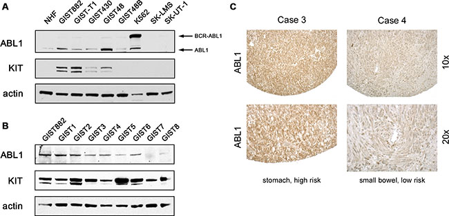Figure 1: KIT and ABL1 are co-expressed in GIST. (A) Whole cell lysates of imatinib-sensitive (GIST882, GIST-T1) and imatinib-resistant (GIST430, GIST48, GIST48B) GIST cell lines were immunoblotted for expression of the ABL1 protein. Lysates of normal human fibroblasts (NHF), the BCR-ABL1-expressing CML cell line K562 as well as the human leimyosarcoma cell lines SK-LMS and SK-UT1 were analyzed in comparison. Arrows depict the native ABL1 protein (125 kDa) as well as the BCR-ABL1 fusion protein (210 kDa) detected exclusively in K562 cells. GIST cells show positive expression of KIT, except for GIST48B, which is a known KIT-negative GIST cell line. Actin stain is shown as loading control. (B) Whole cell lysates of fresh frozen human GIST samples were immunoblotted for expression of the ABL1 and KIT proteins. GIST882 cell lysates were included to compare expression levels to samples shown in (A). (C) ABL1 and KIT expression in primary and metastatic GISTs was assessed by immunohistochemical staining of a tissue microarray (TMA) containing 28 tumors [44]. Examples for high (case 3) and moderate (case 4) ABL1 expression is shown in two GISTs. Top panels, 10× magnification; bottom panels, 20× magnification.