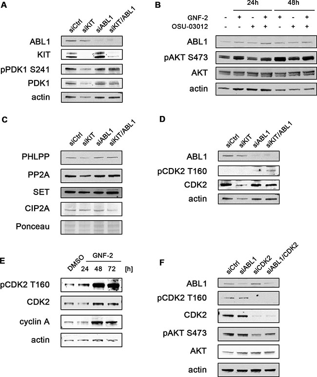 Figure 4: AKT activation after siRNA-mediated knockdown or chemical inhibition of ABL1 is mediated by CDK2. (A) GIST882 cells were transfected with non-targeted siRNA control or siRNA targeting KIT and ABL1 either alone or in combination. Whole cell lysates (72 hours) were immunoblotted for KIT and ABL1 expression levels to confirm appropriate knockdowns. The blot was further probed for phosphorylated (S241) and total PDK1. (B) GIST882 cells were treated with DMSO or the allosteric ABL1 inhibitor GNF-2 and the PDK1 inhibitor OSU-03012 either alone or in combination. Whole cell lysates were immunoblotted for expression levels of ABL1, phosphorylated (S473) and AKT. (C) GIST882 cells were transfected as described in (A). Whole cell lysates were immunoblotted for known regulators of AKT dephosphorylation (PHLPP, PP2A, SET, CIP2A). Total protein Ponceau S stain is shown as a loading control. (D) GIST882 cells were transfected as described in (A). Whole cell lysates were immunoblotted for ABL1 expression as well as phosphorylated (T160) and total CDK2. (E) GIST882 cells were treated with DMSO control or the allosteric ABL1 inhibitor GNF-2 for the indicated times. Whole cell lysates were immunoblotted for expression levels of phosphorylated (T160) and total CDK2 as well as cyclin A. (F) GIST882 cells were transfected with non-targeted siRNA control sequences or siRNA sequences targeting ABL1 and CDK2 either alone or in combination. Whole cell lysates (72 hours) were immunoblotted for ABL1 and CDK2 expression levels to confirm appropriate knockdowns. The blot was further probed for phosphorylated (T160) and total CDK2 as well as phosphorylated (S473) and total AKT.
