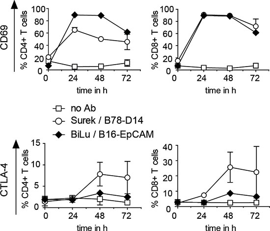 Figure 1: CD69 and CTLA-4 induction on T cells activated with trAbs in vitro. T cells were cultivated with DCs, irradiated B78-D14 or B16-EpCAM cells and trAb Surek or BiLu, respectively, as outlined in Materials and Methods. At different time points, surface expression of CD69 and CTLA-4 on CD4+ and CD8+ T cells was determined by FACS analyses. Mean values and standard deviations from 3 independent experiments are shown.