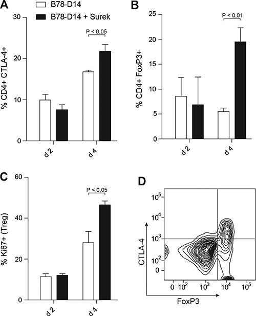 To examine CTLA-4 expression in vivo, a single dose of Surek was injected into mice along with irradiated B78-D14 cells. In this setting, a significant upregulation of CTLA-4 was observed after 4 days (Figure 2A). The frequency of FoxP3+ CD4+ regulatory T cells (Tregs) was also markedly increased at this time point (Figure 2B). As shown by Ki67 staining, this was likely due to enhanced Treg proliferation (Figure 2C). Interestingly, CTLA-4 upregulation on the CD4+ T cells was mainly restricted to the FoxP3+ population (Figure 2D). Since CTLA-4 mediates suppressive functions of Tregs, the data supported the concept of blocking this molecule during trAb therapy.