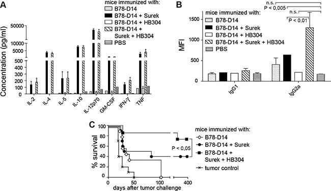 Figure 4: Immunologic memory induced by trAb Surek with or without CTLA-4 blocking. Immunization was done as outlined in Materials and Methods using the indicated immunogens. Irradiated B78-D14 cells as an antigen source were included in each setting. (A) Th1/Th2 cytokines in sera of mice on day 21 after starting immunization. Up to 8 mice were included in each group. For all cytokines tested, the difference between the Surek and the Surek/HB304 group was not significant, while these two groups were different from all other groups with P < 0.005 (Mann-Whitney). (B) Tumor-directed antibodies in sera of mice vaccinated with different immunogens. Binding of serum IgG1 and IgG2a antibodies to melanoma cells was measured by flow cytometry. Mean fluorescence intensities (MFI) are shown as a quantitative measure for antibody coating of tumor cells. Up to 5 animals were included in each group. The columns show means and SEM. Significances (Mann-Whitney) are indicated. The differences between IgG1 titers are not significant. (C) On day 21, mice were challenged with a lethal dose of melanoma cells. The significance is denoted (logrank).