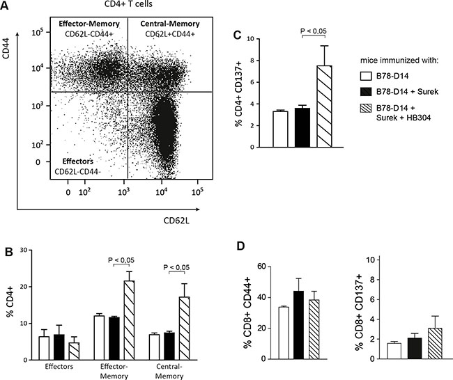 CD137 is a costimulatory molecule that is expressed on the surface of T cells upon antigen-specific and TCR-dependent stimulation. Interestingly, CD137 was elevated on CD4+ T cells that had been primed in vivo by irradiated tumor cells and Surek together with HB304 (Figure 5C). These CD137+ cells were exclusively identified as CD44+ memory cells (data not shown). By contrast, neither an expansion of the memory compartment nor a significant upregulation of CD137 was seen in the CD8+ T-cell population (Figure 5D).