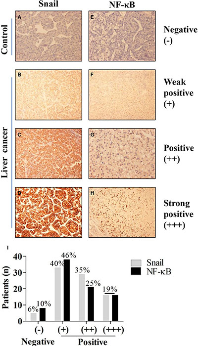 Figure 1: Expression of Snail in HCC tissues. (A–D). Immunohistochemical staining showing expression of Snail in non-tumor liver tissues and in highly differentiated, moderately differentiated, and poorly differentiated HCC tissues. (E–H). Immunohistochemical staining showing expression of NF-κB in non-tumor liver tissues and in highly differentiated, moderately differentiated and poorly differentiated HCC tissues. (I) Rates of Snail and NF-κB staining intensity in HCC patients.